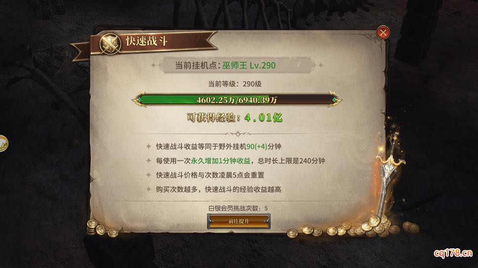 1.快速战斗收益等同于野外挂机90(+4)分钟